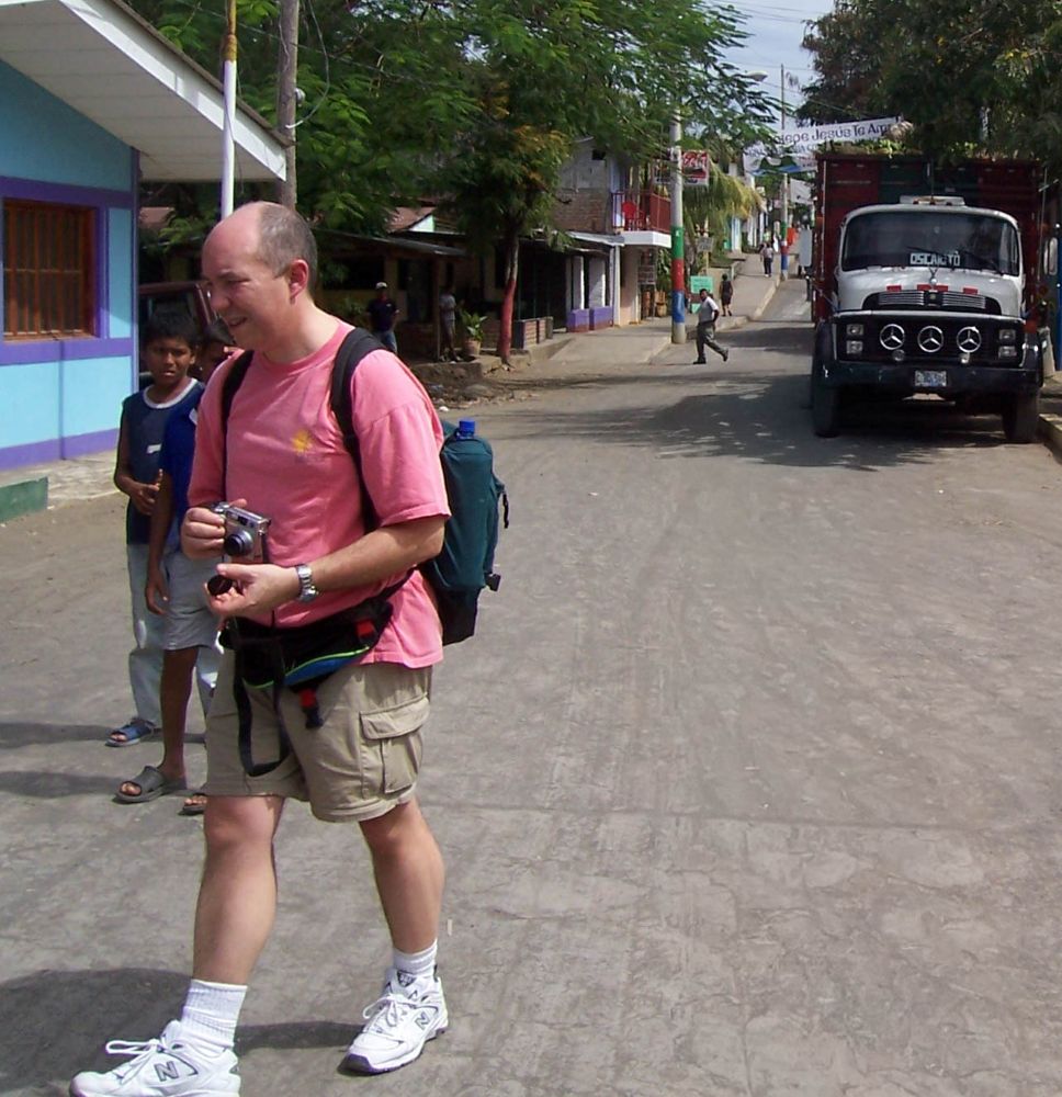 A student was getting a street shot as we were waiting on the ferry over to Ometepe. I was caught crossing the street. (Rivas, Nicaragua, 2004)