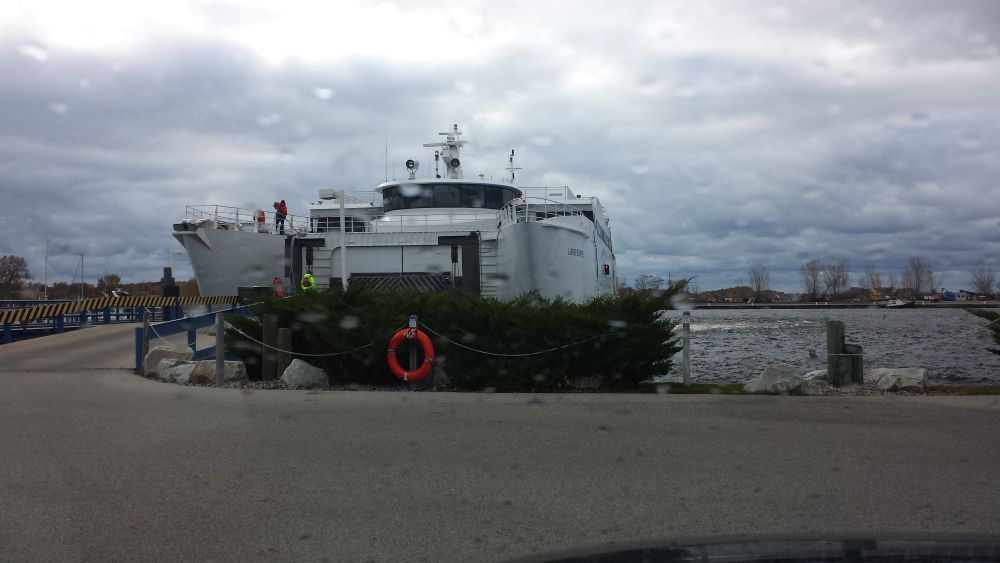 I tell this story often. I was doing a consult in Grand Rapids and they offered to fly me over from Milwaukee. I suggested the ferry–same price and I get to use my car. This surprised them and at each meeting for 2 days, I was introduced as: “this is Julio Rivera from Milwaukee, and he took the ferry.” The only exception to this was my last introduction where it was announced that “the meeting would end at 1:30 because I had to catch the ferry.” Here I am, waiting for the ferry. (Muskegon, Michigan, 2014)