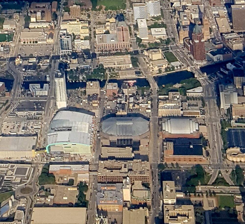How the size of arenas have changed. I was flying out of Milwaukee and I was taking some photos of the city. I noted that all four major indoor sports arenas were standing. The Milwaukee Auditorium (bottom right) hosted major basketball events before the Milwaukee Arena was built (just above it in the photo). The Bradley Center is in the center and the new Fiserv Forum is in the last stages of construction. (Milwaukee, Wisconsin, 2017)