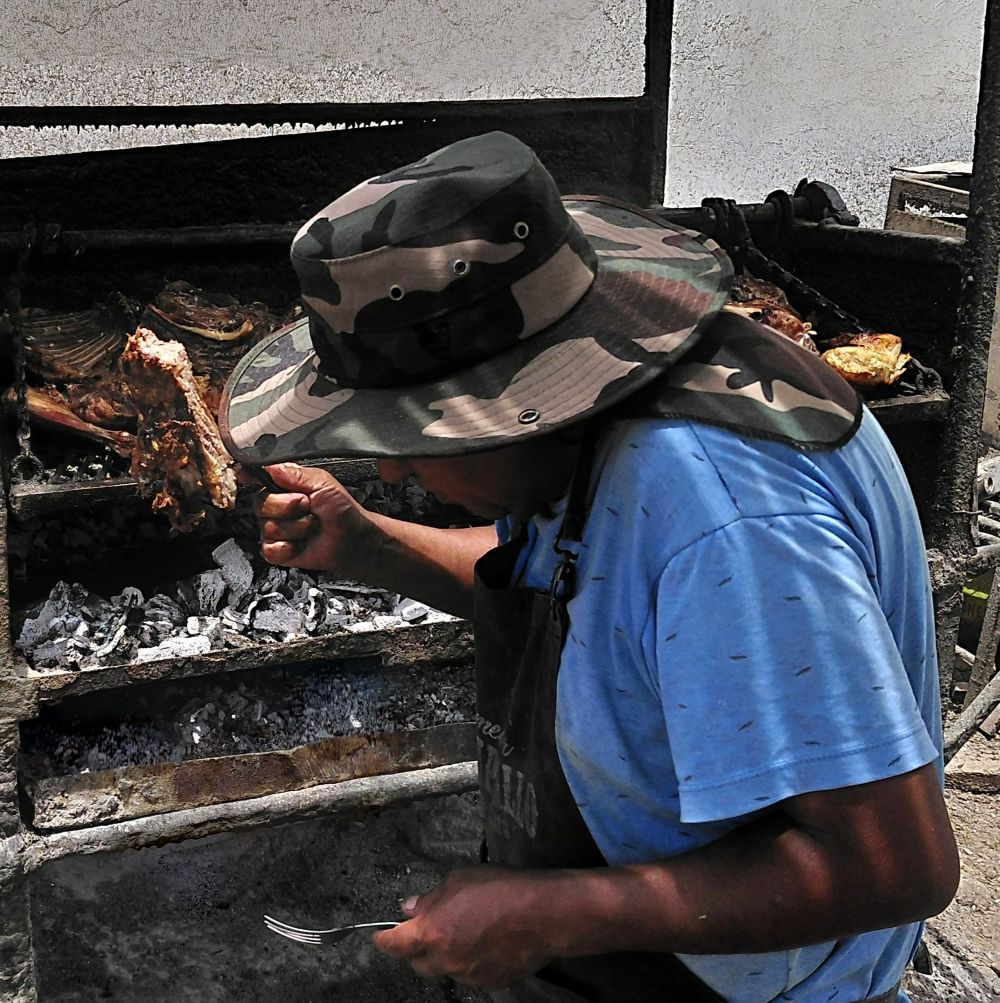 Here is a master at work. Shortly after this photo was taken, he cut off a small piece of meat for me to taste. It was excellent. I love goat–this was really good goat. I stayed for lunch, ate too much. (Cachi, Salta, Argentina, 2025)