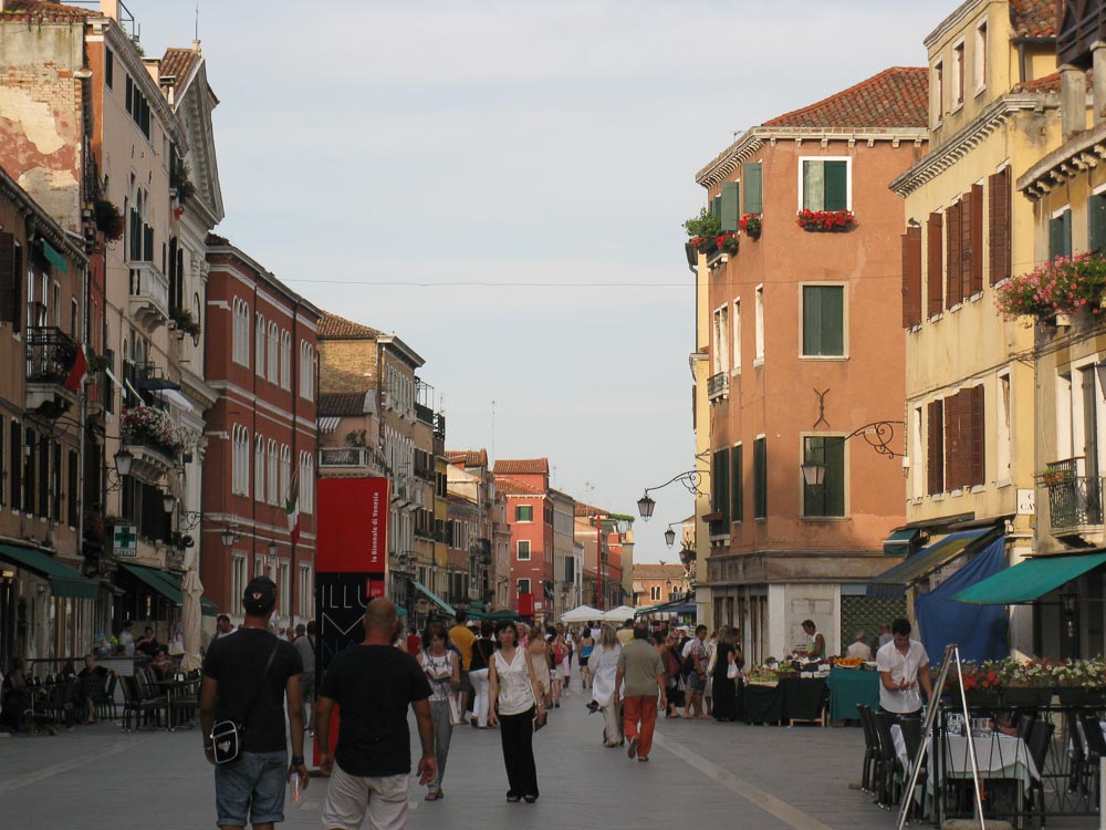 Traveling to famous spots means crowds–but you can evade them a bit. Like most July days, Venice was overwhelmed with people. We wandered over a few bridges, and found a much quieter street with available seats for fine dining. It was a lovely and relaxing evening in our part of town. (Venice, Italy, 2011)