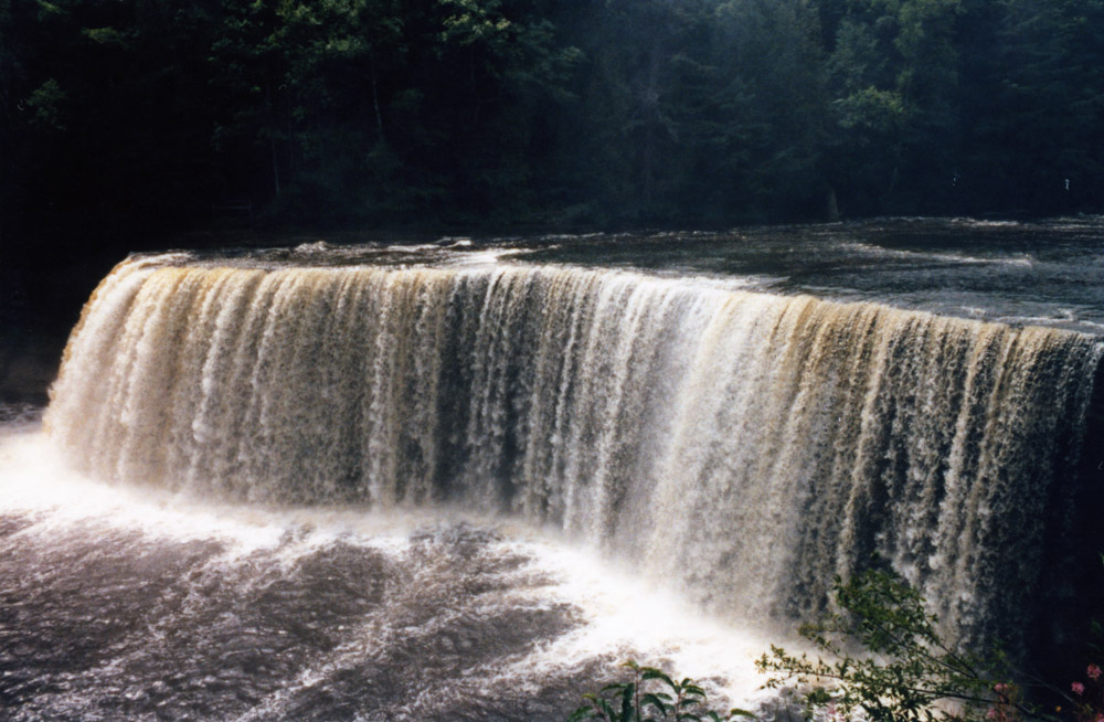 I have been here often (but not recently). When I worked in Northern Michigan, we used to go here on our day off. Color of the falls is a bit brown from the tannins from cedar and hemlock swamps upstream. It has the 2nd largest flow (behind Niagara) in the Eastern United States. (Tahquamenon Falls, Michigan, 1986)